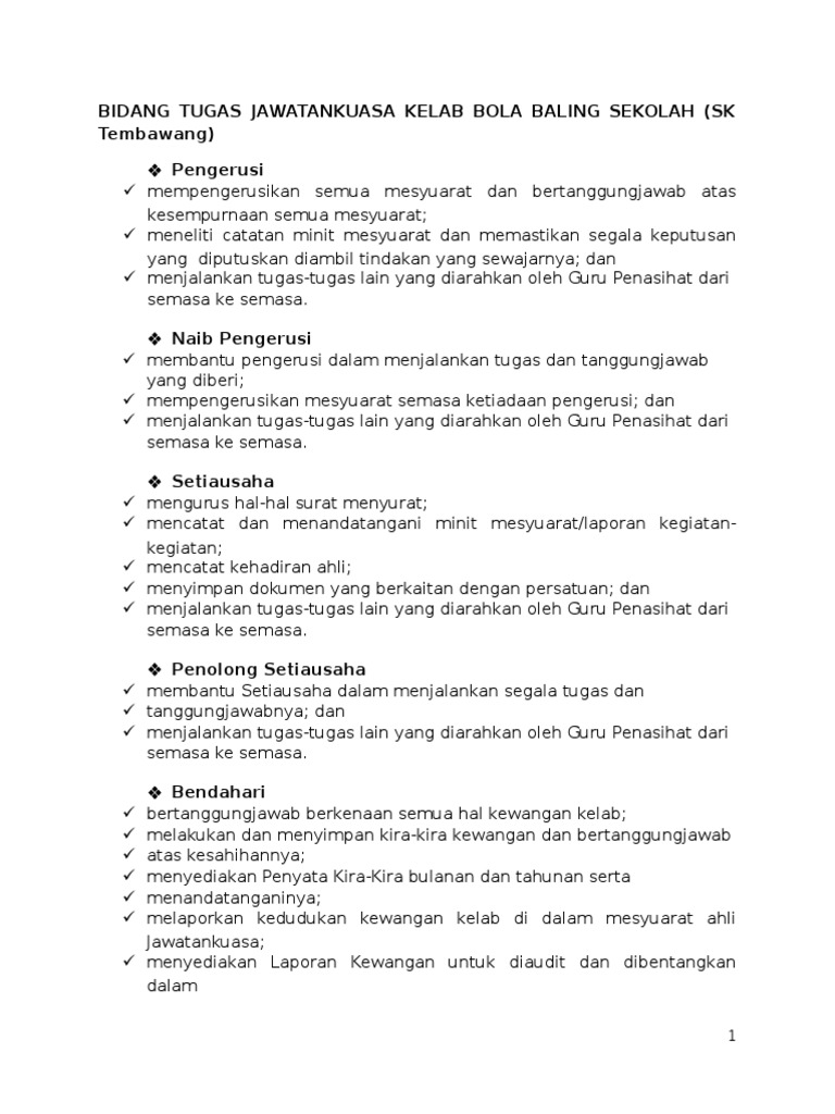 Bidang Tugas Jawatankuasa Kelab Bola Baling Sekolah