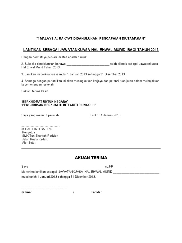 Surat lantikan ini amat penting buat semua guru untuk disimpat sebagai rekod untuk dinilai melalui penilaian bersepadu pegawai perkhidmatan pendidikan. Dokumen serah tugas gpk. Format laporan aktiviti hem tahunan 2017. Surat lantikan sebagai rekod dan rujukan guru guru juga boleh menyimpan dokumen dokumen yang diperoleh sepanjang tahun dengan tersusun.