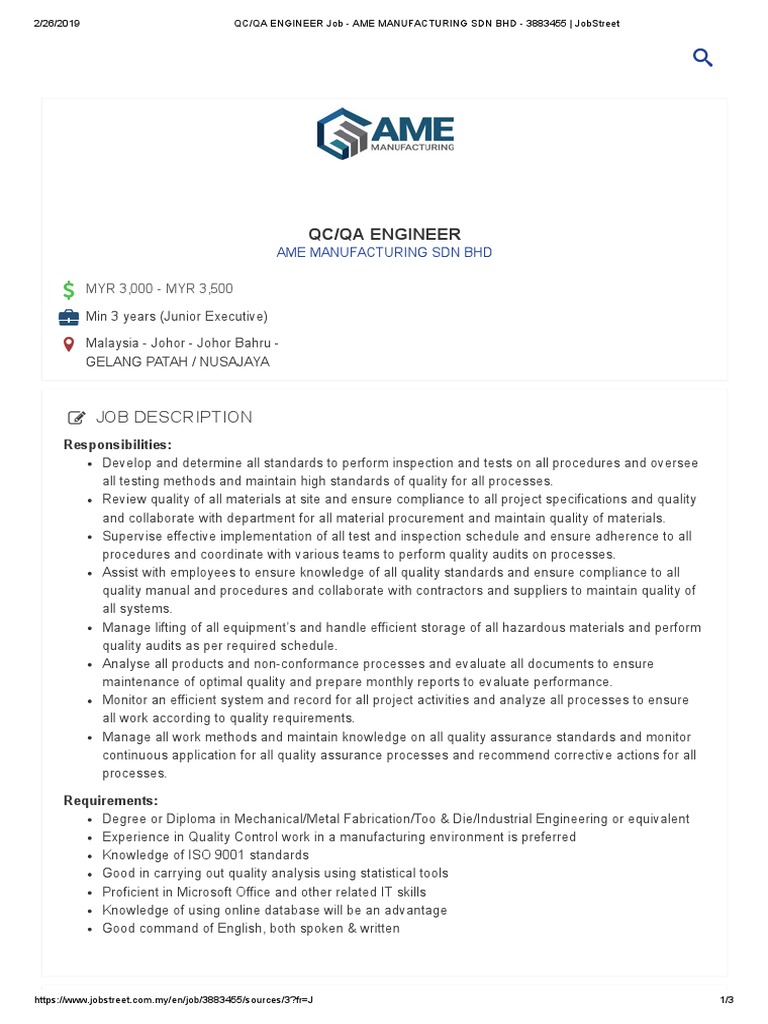 Qc Qa Engineer Job Ame Manufacturing Sdn Bhd 3883455 Jobstreet Quality Assurance Production And Manufacturing