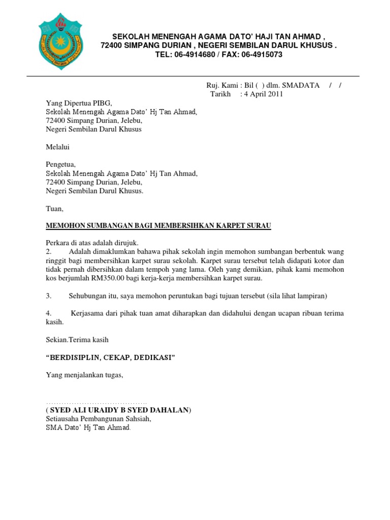 Contoh Surat Rasmi Memohon Sumbangan Derma J Kosong W