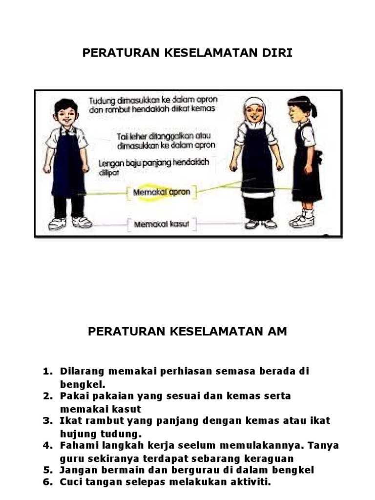 Untuk mengelakan kemalangan ketika berada di tempat kerja beberapa peraturan hendaklah dipatuhi. Dapatkan kebenaran guru sebelum masuk atau keluar dari bengkel. Keselamatan diri sendiri 1. Peraturan tersebut ialah.