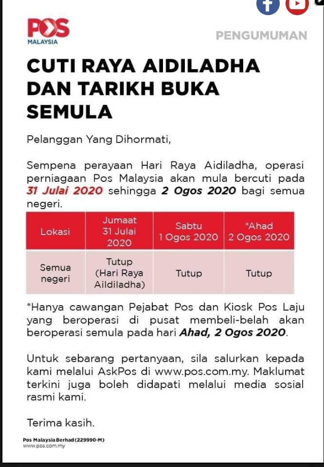 Tarikh Operasi Pos Malaysia Dan Pos Laju Pada Cuti Hari Raya Aidilfitri 2020 Layanlah Berita Terkini Tips Berguna Maklumat