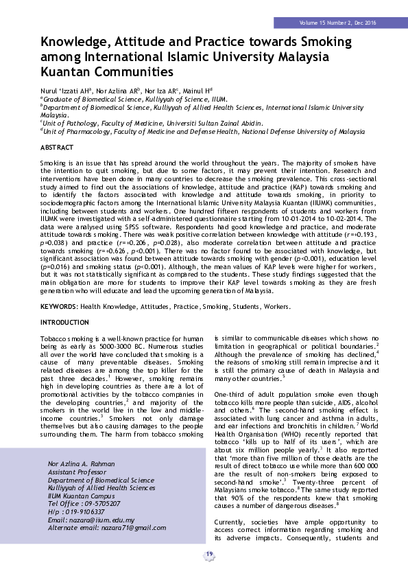 Pdf Knowledge Attitude And Practice Towards Smoking Among International Islamic University Malaysia Kuantan Communities Mainul Haque Academia Edu