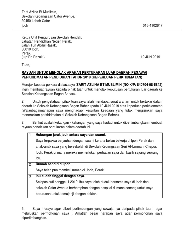 Surat Rayuan Tolak Pertukaran Tempat Kerja